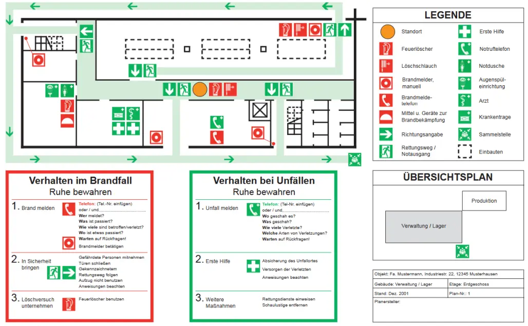 - Standorte von Brandbekämpfungs-, Alarmierungs- und Erste-Hilfe-Einrichtungen